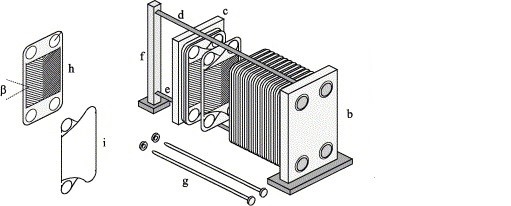 h) مجموعه صفحات واشربندی شده، که در واقع هر دو سیال سرد و گرم، یک در میان در میان آنها جریان دارد. در اینجا واشرها علاوه بر هدایت سیال مانع از نشت سیال به بیرون از مبدل میشود و از آمیخته شدن دو سیال با هم نیز جلوگیری میکند.